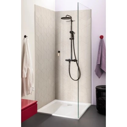 Genießen Sie mit dem Grohe QuickFix Duschsystem Vitalio Start System 250 die große Bewegungsfreiheit in der Dusche, die verschiedenen angenehmen Strahlarten und den Komfort, den ein Thermostat bietet. Das Aufputz-System für die Wandmontage besteht aus einer Vitalio Start 250 Kopfbrause, einer Vitalio Start 100 Handbrause, einem Thermostat, einer Brausestange mit einem 390 mm langen schwenkbaren Brausearm und einem Gleitelement zum Einstellen der Handbrause sowie einem 1.750 mm langen VitalioFlex Comfort TwistStop Schlauch. Die 250 mm große Kopfbrause bietet einen sanften, entspannenden Rain Strahl. In der 100 mm großen Handbrause ist ein ShockProof Silikonring integriert, der sie vor Beschädigungen durch Herunterfallen oder Stöße schützt. Die Handbrause bietet 2 Strahlarten: den sanften Rain Strahl und den kraftvollen, gezielten Jet Strahl. Beide Brausen verfügen über die Grohe Wasserspartechnologie. Durch sie wird der Wasserfluss auf 9,5 l/Min. für die Kopfbrause und auf 5,7 l/Min. für die Handbrause begrenzt. So reduzieren sie den Wasserverbrauch, ohne an Leistung einzubüßen. Die Grohe DreamSpray Technologie sorgt dafür, dass der Wasserfluss aus jeder Düse perfekt dosiert ist, um Ihr Duscherlebnis so komfortabel und angenehm wie möglich zu machen. Die SpeedClean Düsen lassen sich durch einfaches Abwischen von Kalkablagerungen befreien. Dank der Grohe TurboStat Technologie garantiert das Duschsystem eine konstante Wassertemperatur ohne böse Überraschungen. Zum Schutz vor Verbrühungen ist der Grohe SafeStop Temperaturbegrenzer auf 38 °C eingestellt, damit Kinder nicht versehentlich eine zu hohe Wassertemperatur einstellen. Für noch mehr Sicherheit kann der Grenzwert mit dem Grohe SafeStop Plus Temperaturbegrenzer auch auf 43 °C eingestellt werden. Zwischen Kopf- und Handbrause wechseln und die Wassermenge anpassen – dank der AquaDimmer Funktion geht das alles mit nur einem Griff. Dank der langlebigen, pflegeleichten Grohe Long-Life Shine Beschichtung glänzt das Duschsystem viele Jahre lang makellos. Noch mehr Komfort und Platz bietet die optionale Grohe EasyReach Ablage. Damit haben Sie Duschgel und Shampoo immer griffbereit. Separat erhältlich.