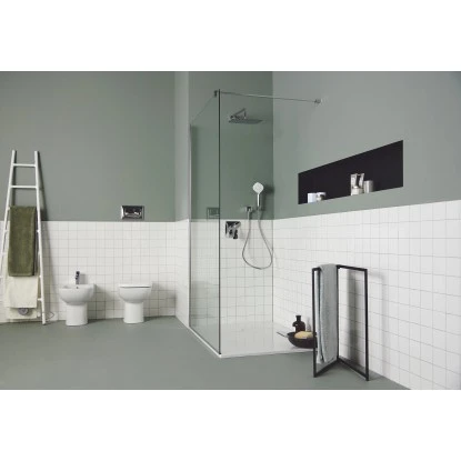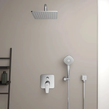 Idealrain ist ein vollständiges Brauseprogramm mit allen Komponenten zur Ausstattung eines schönen und komfortablen Duschbereichs. Dazu zählen zum Beispiel Handbrausen mit Navigo-Umschaltung und formschöne Kopfbrausen.