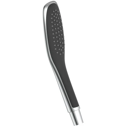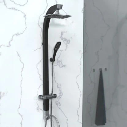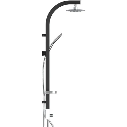 Die Brausestange aus Aluminium ist durchgängig in Schwarz gehalten. Details wie Umsteller, Kopfbrause, Seifenschale und Zierseiten sind verchromt abgesetzt und runden das Bild ab.